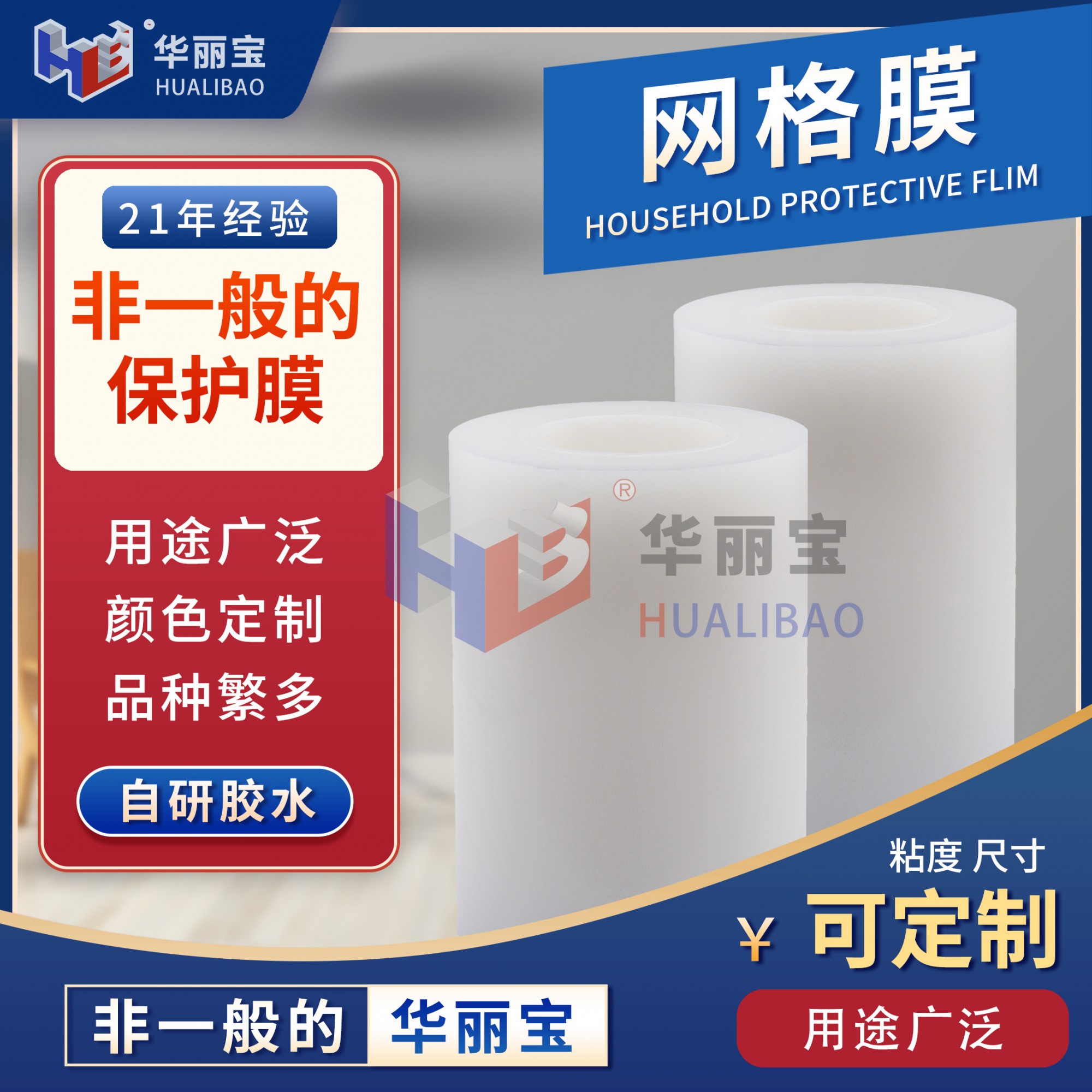 华丽宝网纹膜是一种单层PE透明保护膜,以PE膜为基材,网状为涂胶形成,排气性好。普通的PE网格膜通常为低粘,华丽宝PE大网格保护膜可做到超高粘。