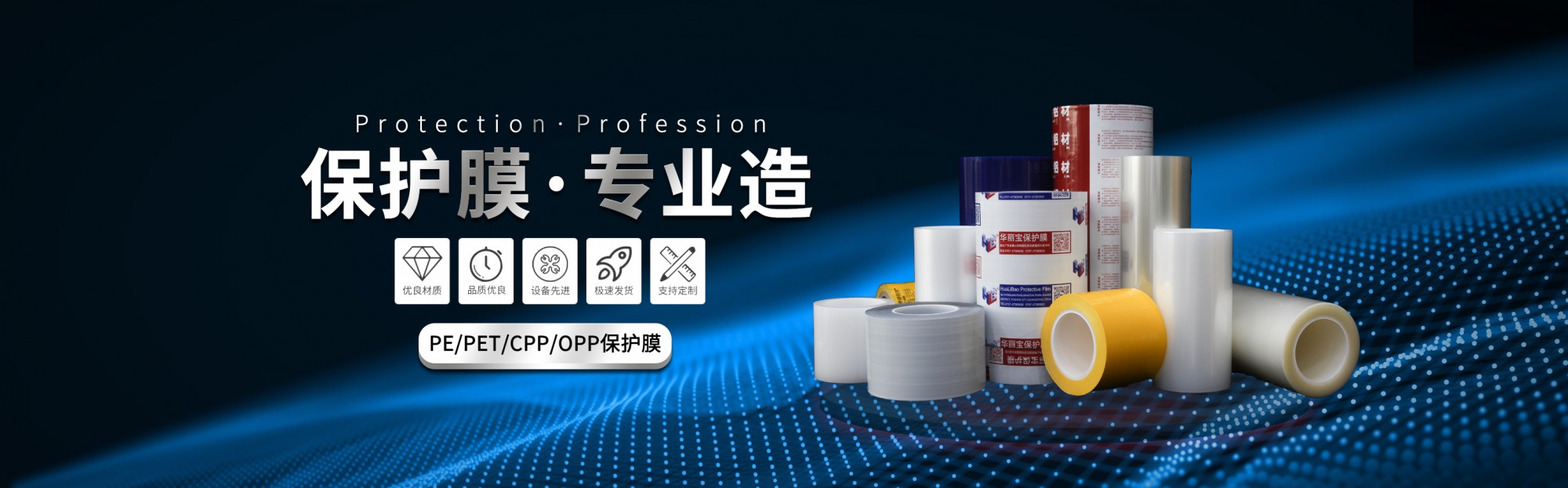 广东华丽宝实业有限公司,一家生产PE保护膜、PET保护膜、磨砂膜、BOPP保护膜、网纹膜、CPP保护膜、铝材保护膜、不锈钢保护膜、家具膜、铝型材保护膜、静电膜、地毯膜、PE耐高温保护膜、转移膜系列、定位纸等适用各种产品表面保护,品种齐全,质量保证。